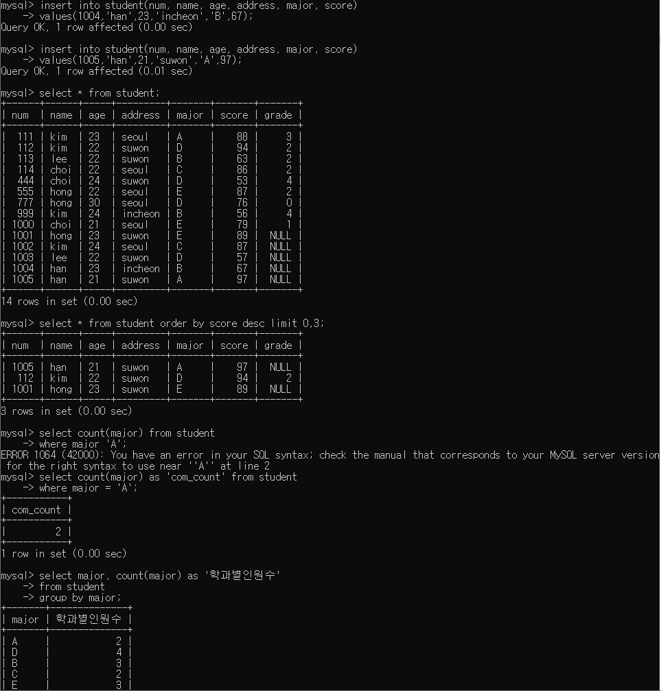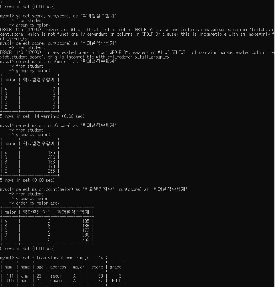select major,count(major) as '학과별인원수' ,sum(score) as '학과별점수합계', round(avg(score),1) as '학과별점수평균'