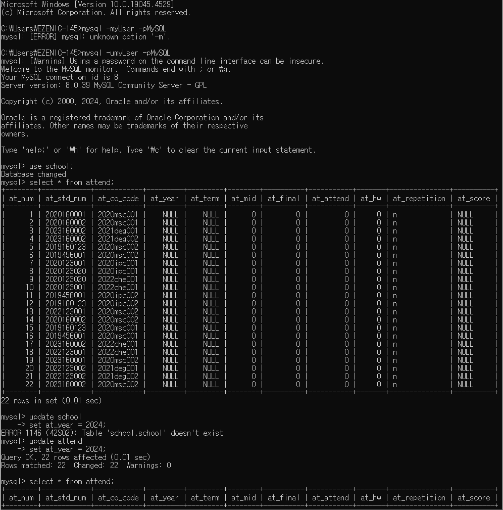오늘은 procedure에 대해서 배워보도록 하겠습니다 목차1.join 복습2.procedure3.느낀점 1. join 복습db - day06school 데이터베이스에서 처리- course 테이블에 해당 코스의 수강인원을 집계하는 필드를 생성필드명 : co_degreeco_degree 필드에 해당 코스를 듣고 있는 학생을 집계하여 업데이트alter table course add co_degree int after co_timetable;start transaction;update courseset co_degree = (select count(a.at_co_code) from attend awhere a.at_co_code = co_code);commit;-- 다른 풀이과정update course set..