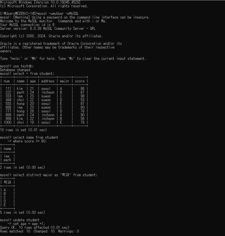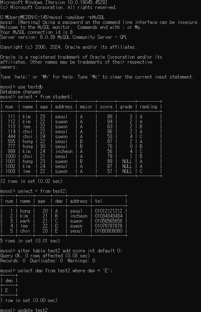 오늘은 procedure에 대해서 배워보도록 하겠습니다 목차1.join 복습2.procedure3.느낀점 1. join 복습db - day06school 데이터베이스에서 처리- course 테이블에 해당 코스의 수강인원을 집계하는 필드를 생성필드명 : co_degreeco_degree 필드에 해당 코스를 듣고 있는 학생을 집계하여 업데이트alter table course add co_degree int after co_timetable;start transaction;update courseset co_degree = (select count(a.at_co_code) from attend awhere a.at_co_code = co_code);commit;-- 다른 풀이과정update course set..
