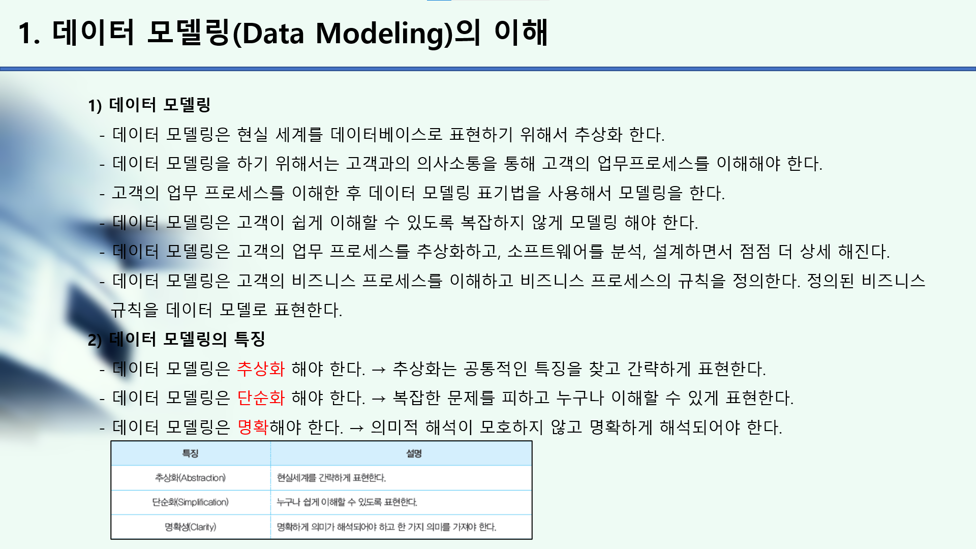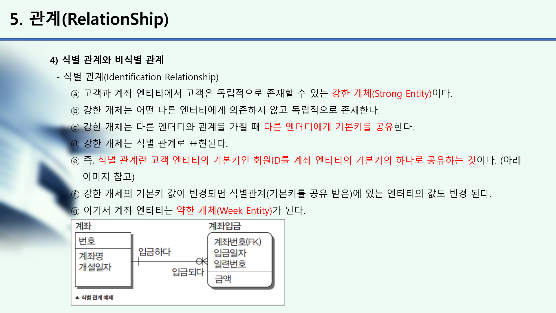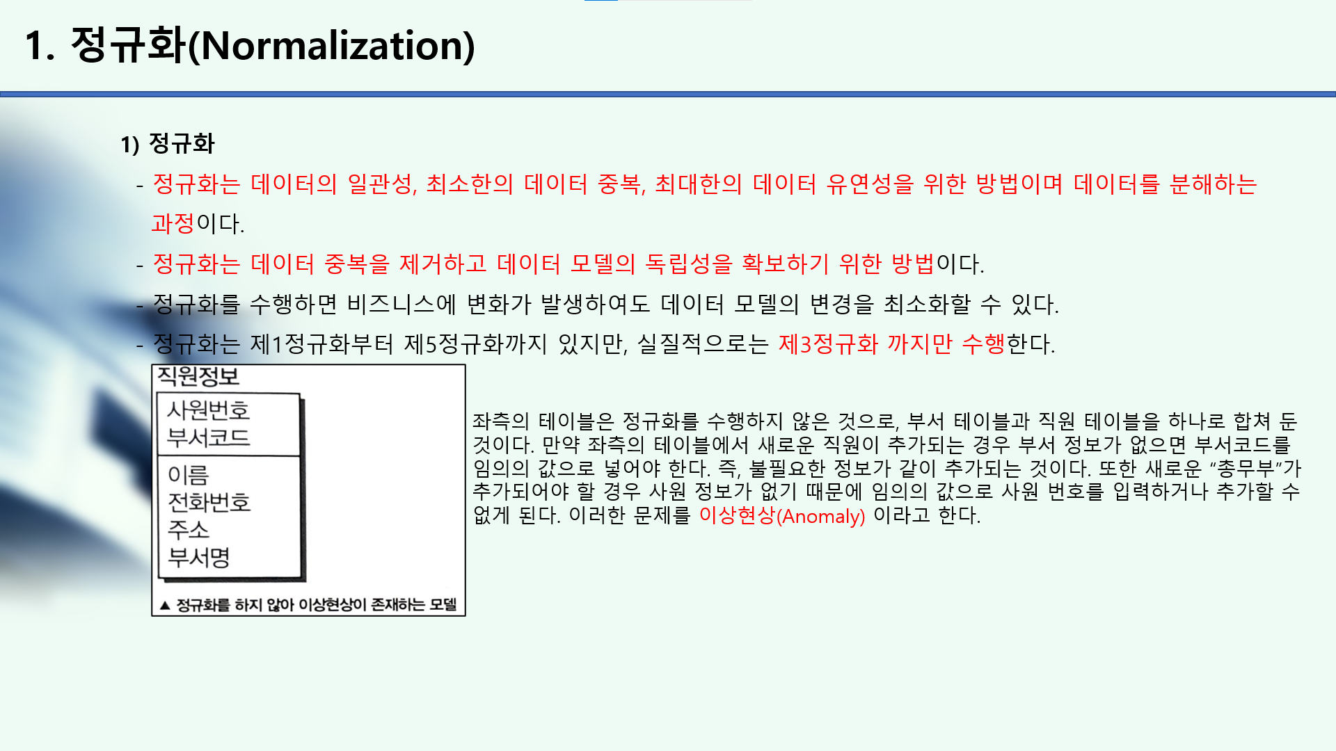 목차1.정규화2.내용 요약 1. 정규화 2. 내용 요약■ 정규화○ 정규화- 데이터의 일관성, 최소한의 데이터 중복, 최대한의 데이터의 유연성을 위한 방법이며 데이터를 분해하는 과정임- 데이터 중복을 제거하고 데이터 모델의 독립성을 확보하기 위한 방법임- 제1정규화부터 제5정규화까지 있지만, 실질적으로는 제3정규화까지만 수행함- 정규화를 하지 않으면 이상현상이 생길 수 있음- 이상현상 같은 문제를 해결하기 위해서는 테이블을 분해 해야 함 ○ 정규화 절차1) 제1정규화- 속성의 원자성을 확보함- 기본키를 설정함 2) 제2정규화- 기본키가 2개 이상의 속성으로 이루어진 경우, 부분 함수 종속성을 제거(분해)함 3) 제3정규화- 기본키를 제외한 칼럼 간에 종족성을 제거함. 즉, 이행함수 종족성을 제거함 4)..