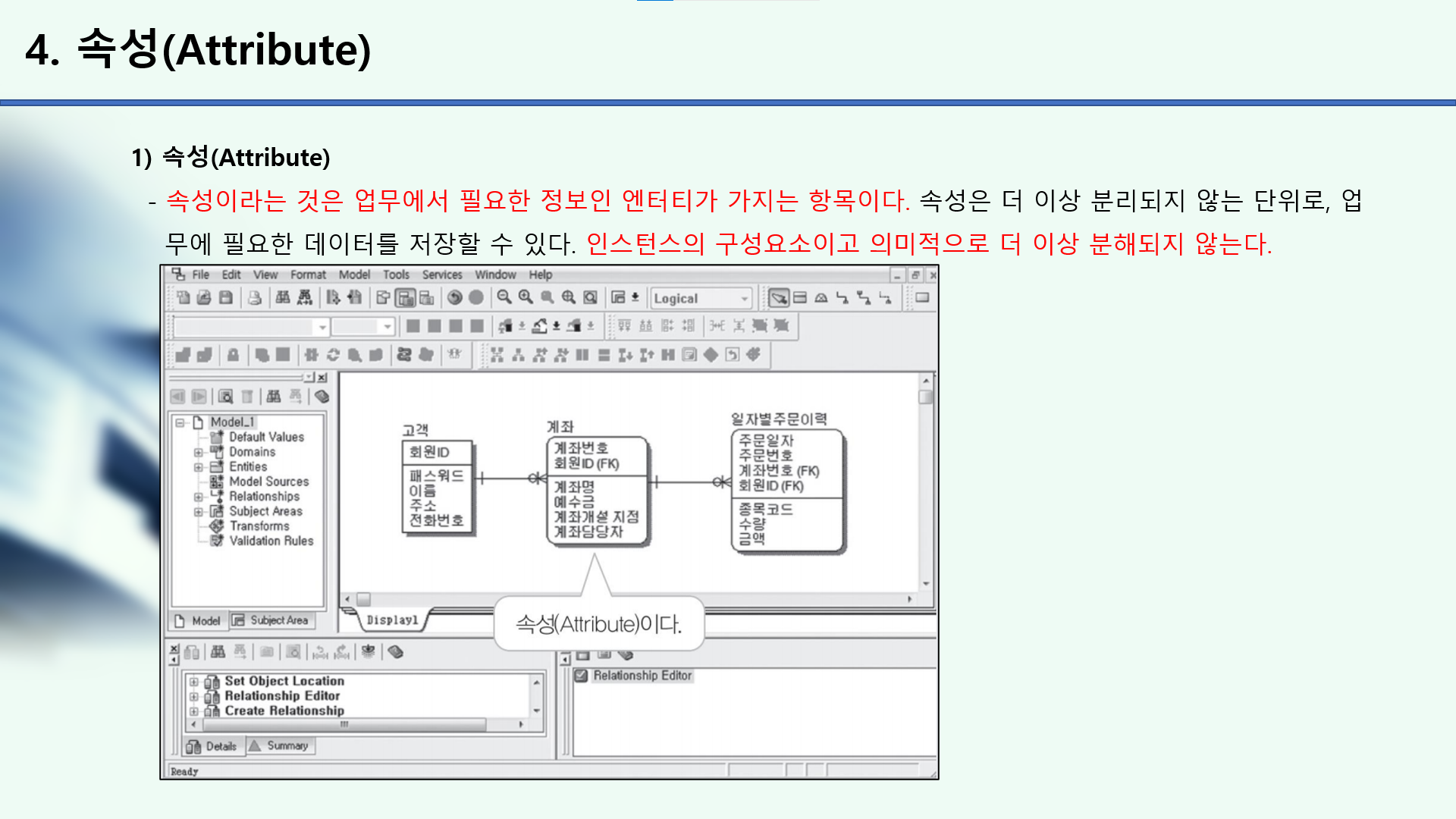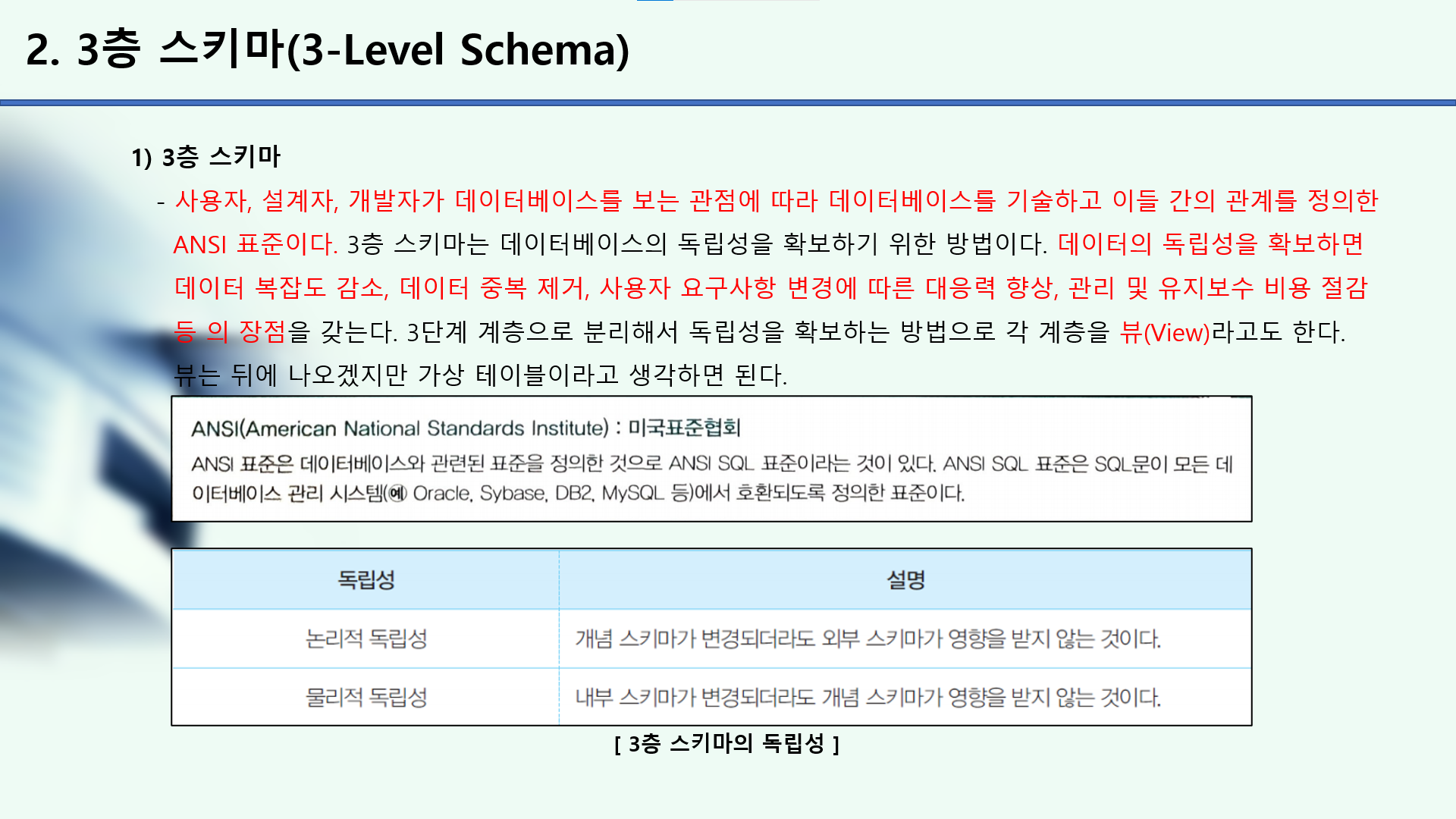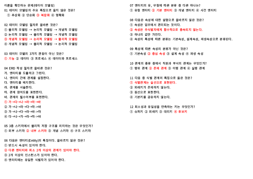 목차1.정규화2.내용 요약 1. 정규화 2. 내용 요약■ 정규화○ 정규화- 데이터의 일관성, 최소한의 데이터 중복, 최대한의 데이터의 유연성을 위한 방법이며 데이터를 분해하는 과정임- 데이터 중복을 제거하고 데이터 모델의 독립성을 확보하기 위한 방법임- 제1정규화부터 제5정규화까지 있지만, 실질적으로는 제3정규화까지만 수행함- 정규화를 하지 않으면 이상현상이 생길 수 있음- 이상현상 같은 문제를 해결하기 위해서는 테이블을 분해 해야 함 ○ 정규화 절차1) 제1정규화- 속성의 원자성을 확보함- 기본키를 설정함 2) 제2정규화- 기본키가 2개 이상의 속성으로 이루어진 경우, 부분 함수 종속성을 제거(분해)함 3) 제3정규화- 기본키를 제외한 칼럼 간에 종족성을 제거함. 즉, 이행함수 종족성을 제거함 4)..